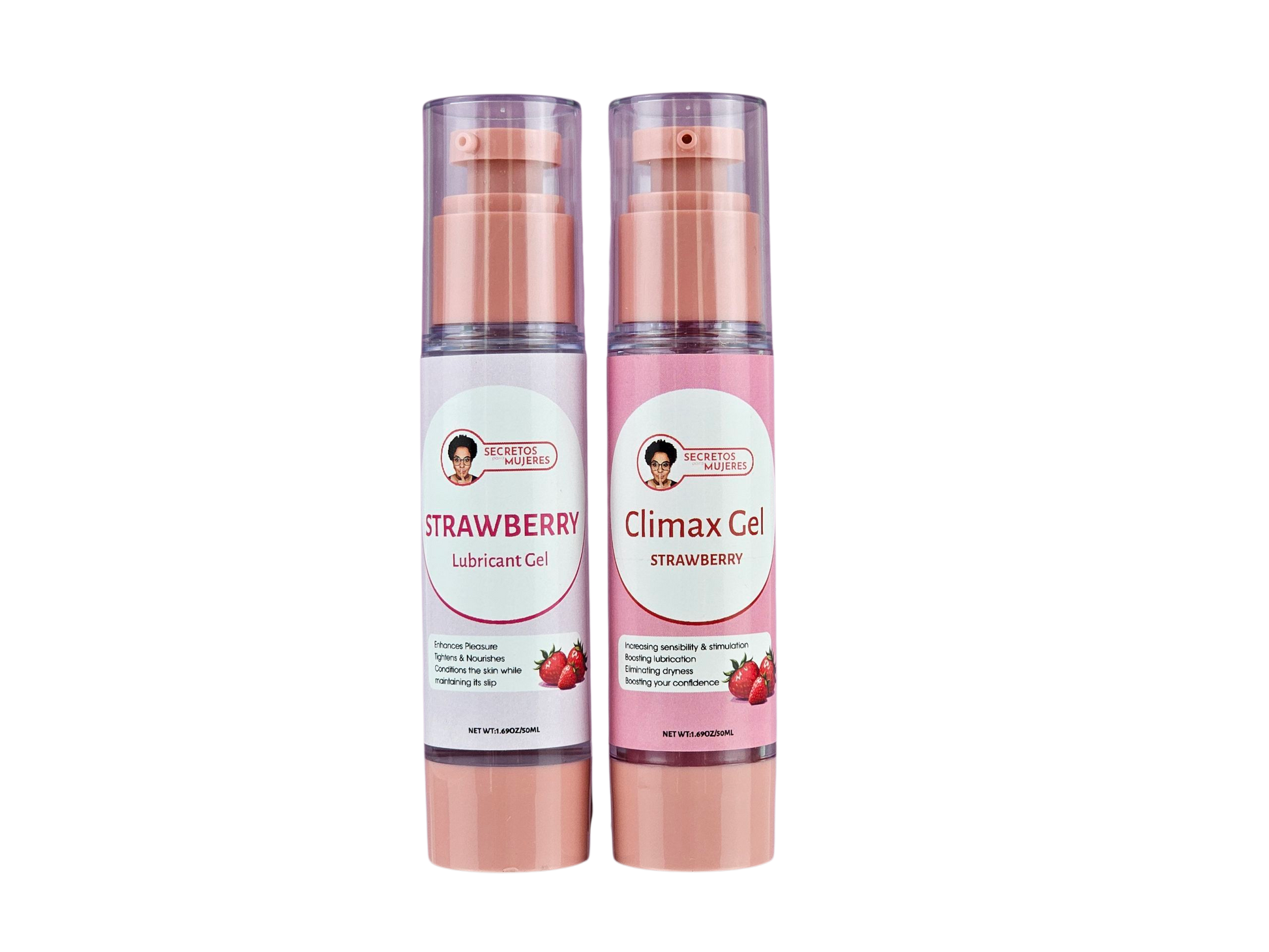 Jugosa Intimidad | Fresa es el dúo perfecto para el placer íntimo – un lubricante con sabor a fresa y un gel de clímax refrescante y estimulante. Con extractos naturales, este set aumenta la sensibilidad, elimina la resequedad, mejora la lubricación y eleva tu confianza para momentos inolvidables.