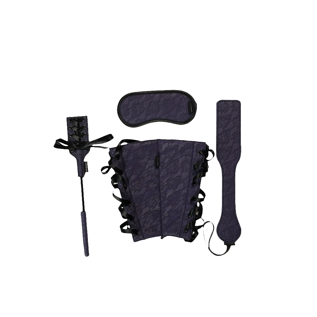 Adéntrate en el mundo de las perversiones con un juego de cuatro partes de lujo que incluye una venda para los ojos, una paleta, un fusta y reposabrazos. La paleta y la fusta llevan a la maestría los dolorosos experimentos de placer, la venda de los ojos quita la vista a la sensación del foco, y las restricciones de los brazos se unen para la sumisión sensual. Los acentos de satén y el material afelpado con estampado de encaje añaden un toque de suavidad para contrastar la audaz intensidad del juego BDSM.